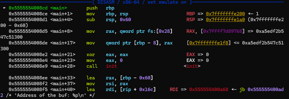 gdb로 메인함수를 살펴보면 메인함수에서 0x60바이트 만큼의 스택을 할당하는 것을 볼 수 있고